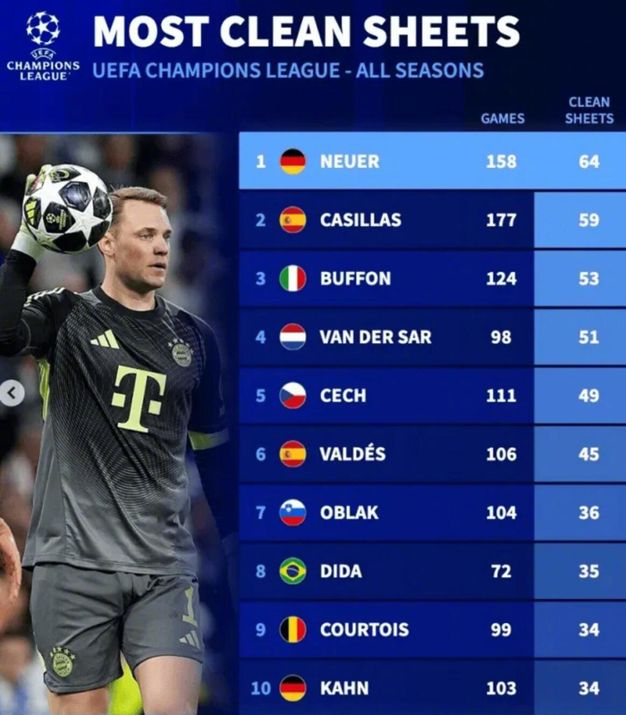 根据德国转会市场的统计,诺伊尔是欧冠联赛历史上完成零封次数最多的门将——他在158场欧冠联赛里完成了64次零封,总计丢掉146球,平均每93分钟才会丢掉1球。